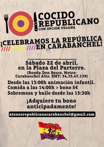 Abril es el mes de la república, y para celebrar la efeméride este año el Ateneo Republicano de Carabanchel opta por un valor seguro: un buen cocido (¿quién se resiste a un buen cocido? Nosotros no, desde luego…). Eso sí, para asegurarse de que nadie queda excluido, también han pensado en una opción vegana. La celebración no será el 14 (día en que se proclamó la II República), sino el sábado 22, en la plaza del Parterre, y habrá desde las 13:00 animación infantil. La comida será a las 14:00, y luego tendremos sobremesa y baile desde las 15:30, como toda fiesta popular que se precie. Buen provecho, vecinos… Cuándo: 22 de abril, desde las 13:00. Dónde: plaza del Parterre. Cuánto: bono de 5. Adquisición anticipada de bonos: ateneorepublicanocarabanchel@gmail.com.14º Fiesta del Libro de Carabanchel Alto