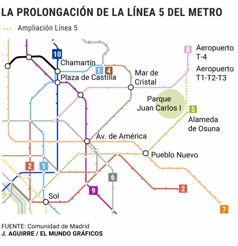 - Así que la conexión con Adolfo Suárez-Barajas a través de la línea 5 podría empezar a funcionar a partir del año 2024, aunque la Comunidad de Madrid tampoco descarta 2025 como la fecha de puesta en marcha del servicio.