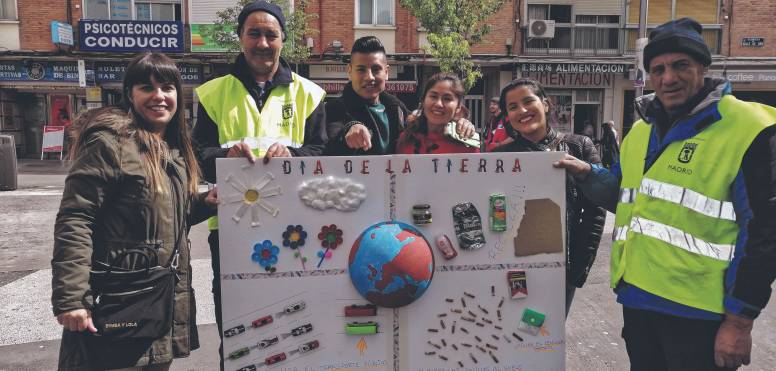Respecto a las distintas jornadas de sensibilización llevadas a cabo, resulta importante señalar la jornada unitaria de todos los Equipos de Actuación Distrital del 16 de marzo, donde cada distrito trató de visibilizar no solo el trabajo que se realiza de manera habitual, mediante el acondicionamiento de las plantaciones de la glorieta de Valle de Oro en el caso de la FSMP, sino también con intervenciones de concienciación sobre la problemática de las heces, a través de un teatro con títeres realizados con materiales reciclados, pintura de juegos tradicionales en el suelo y la visibilización de la recogida de publicidad sexista.