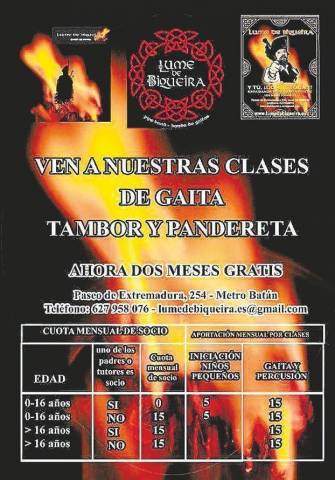 Clases en paseo Extremadura gaitaLa banda de gaitas Lume de Biqueira comienza sus cursos de gaita, tambor y pandereta en su local del paseo de Extremadura. El de iniciación para niños será los viernes de 19:00 a 20:00 o flexible en función de las necesidades de los padres y la disponibilidad de la profesora. El de Gaita 1 (principiantes) será los miércoles de 19:00 a 20:00. El de Gaita 2, los miércoles de 20:05 a 21:00. El de Gaita 3, los jueves de 19:00 a 20:00. El de Tambor 1 (para principiantes) y Pandereta, los jueves de 19:00 a 20:30. Si alguien quisiera tomar clases de Timbal, o de Perfeccionamiento de Tambor, se tratará una vez conocidas las personas que desean recibirlas, y se haría el jueves en cualquier caso. Hay oferta de dos meses gratis. Cuándo: horarios diversos. Dónde: paseo de Extremadura, 254. Más información: 627 958 076 / lumedebiqueira.es@gmail.com.