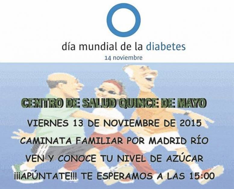 Caminar para la saludEn torno al Día Mundial de la Diabetes, que se celebra el 14 de noviembre, los centros de salud acostumbran a organizar actividades para conmemorarlo. Generalmente suelen ser caminatas, por ser idóneas para mantener adecuados niveles de azúcar/glucosa. En este sentido nos han llegado dos actividades de sendos centros de salud del barrio. Así, el Centro de Salud Carabanchel Alto realizará un “paseo saludable” el 12 de noviembre, que saldrá a las 10:30 desde el propio centro. Al día siguiente, 13, el Centro de Salud Quince de Mayo ha programado una “caminata familiar” por Madrid Río, que sale a las 15:00, también del propio dentro, y en la que podrás conocer además tu nivel de azúcar. Son actividades amenas y sanas, así que no lo dudes: apúntate. Cuándo: 12 y 13 de noviembre. Dónde: centros de salud Carabanchel Alto y Quince de Mayo. Cuánto: gratis.