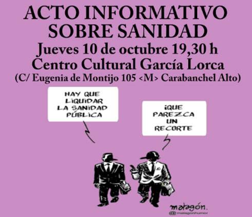 El próximo jueves 10 de octubre a las 19,30 h hemos organizado un acto informativo sobre Sanidad en el Centro Cultural García Lorca (C/ Eugenia de Montijo 105,