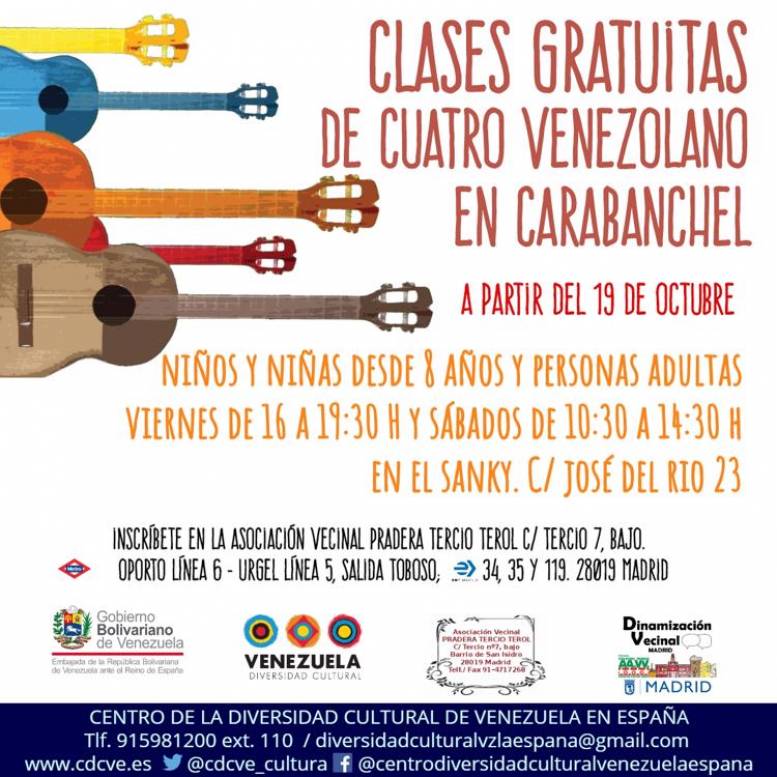 Clases gratis cuatro Venezolano[/caption]La Asociación Vecinal Pradera Tercio Terol y el Servicio de Dinamización Vecinal de San Isidro nos proponen un nuevo taller de música, para peques y mayores y totalmente gratuito, que da comienzo el 19 de octubre. La intención del mismo es “poner en valor la música como instrumento de transformación social y mejora en el barrio”, y en él se trata de sensibilizar y dar a conocer mediante la formación grupal el uso del cuatro, instrumento procedente de Venezuela, parecido a una guitarra pequeña. Una excelente oportunidad de conocer un instrumento poco habitual por estos lares, y además sin salir del barrio. El taller estará dirigido por José Vicente Muñoz, promotor cultural del Centro de la Diversidad Cultural de Venezuela en España y músico venezolano con una trayectoria profesional extensa. Cuándo: A partir del 19 de octubre. Dónde: Sanky (C/ José del Río, 23). Más información e inscripciones: Asociación Vecinal Pradera Tercio Terol (C/ Tercio, 7, bajo).