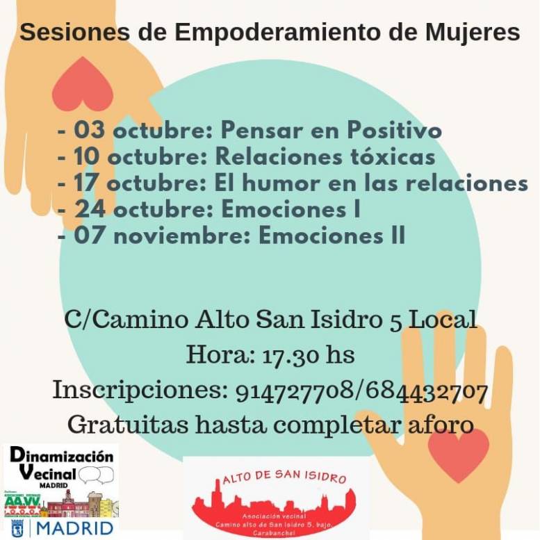 Empoderamiento de las mujeres[/caption]El Servicio de Dinamización Vecinal y la A.V. Alto de San Isidro nos proponen para este mes varias “sesiones de empoderamiento de mujeres”, abordando en ellas distintos temas. Al cierre de esta edición ya ha tenido lugar la primera (Pensar en positivo) el 3 de octubre. Las próximas tendrán lugar los días 10 (Relaciones tóxicas), 17 (El humor en las relaciones), 24 (Emociones I) y 7 de noviembre (Emociones II). Como podéis ver, todos los temas son de gran interés para el objetivo enunciado, por lo que la asistencia es muy recomendable. Dónde: A.V. Alto de San Isidro (C/ Camino Alto de San Isidro, 5, local). Cuándo: 10, 17 y 24 de octubre, y 7 de noviembre, a las 17:30. Cuánto: gratis hasta completar aforo. Más información e inscripciones: