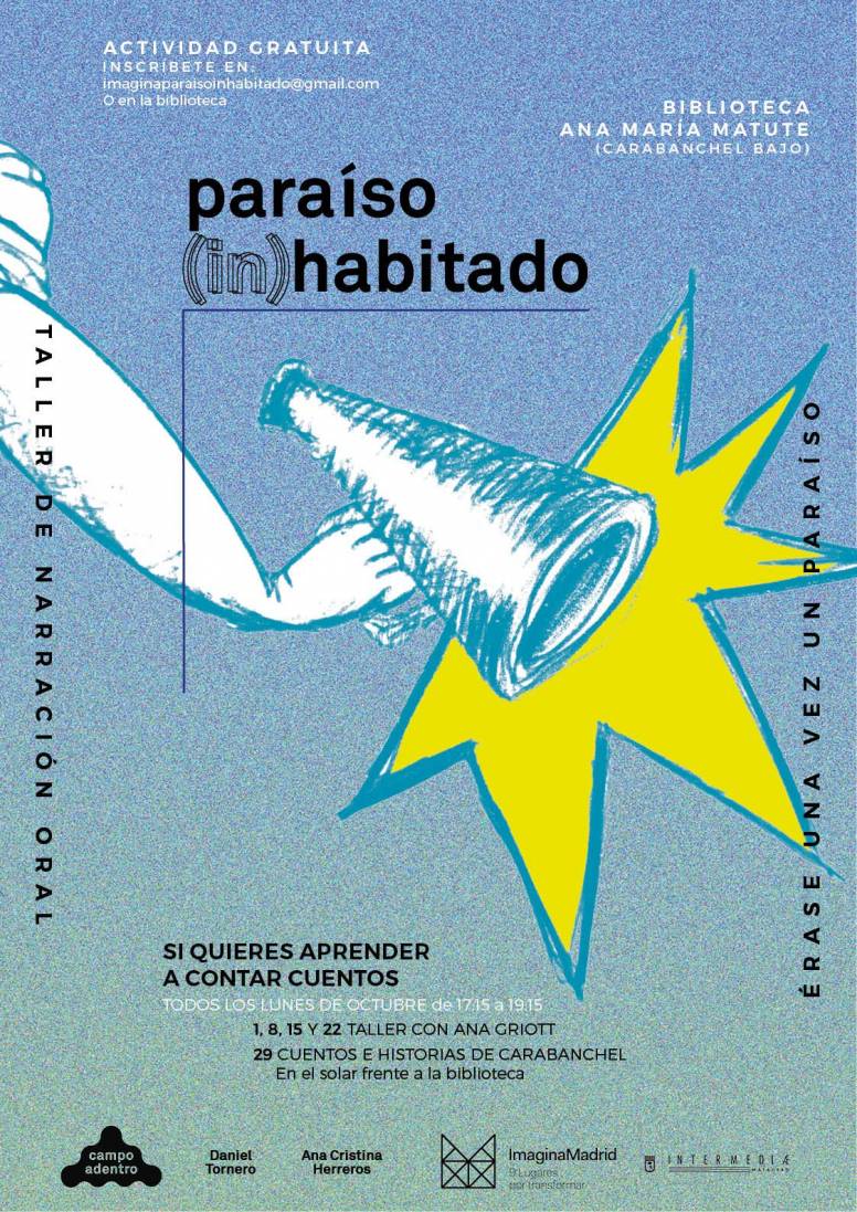 Contamos siempre: contamos cómo nos ha ido el día, cómo nos sentimos, contamos quiénes somos, de dónde venimos, contamos la historia de nuestra familia, los cuentos que nos contaron de niños. Aprender a contar de otra manera nos hace aprender a vivir de otra manera. Por ello, Paraíso (in)Habitado os invita al taller de narración oral que impartirá la narradora y escritora Ana Griott en la Biblioteca Ana María Matute. Cuándo: Todos los lunes de octubre, de 17:15 a 19:15. Dónde: Biblioteca Ana María Matute (C/ de los Comuneros de Castilla, 30).
