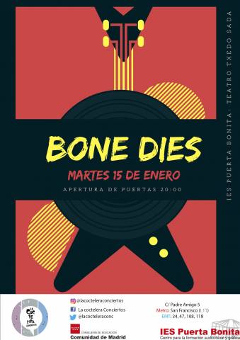 Sibyla, la poderosa profetisa del mundo antiguo, es el personaje central de un concierto-performance con videoinstalación. Sibyla está desdoblada en dos cantantes-performers. El espacio sonoro es envolvente y extático; el sonido se genera y procesa en directo mediante el uso de micrófonos, amplificadores, altavoces y programas de audio que distorsionan y multiplican las voces. Las videoproyecciones nos permiten adentrarnos en la gruta de la Sibyla, consultar oráculos, conocer la multiplicidad de las diferentes Sibylas de la historia pasada y de la actualidad y recrearnos en la contemplación de diversos fenómenos naturales y azarosos. Sibyla es un viaje en el tiempo y en el espacio, que induce al espectador a entrar en un estado mental diferente. Cuándo: 10, 17, 24 y 31 de enero, a las 21:00. Dónde: Sala Tarambana (C/ de Dolores Armengot, 31). Cuánto: 12 (anticipada), 14 (taquilla).Bone Dies, concierto en el IES Puerta Bonita