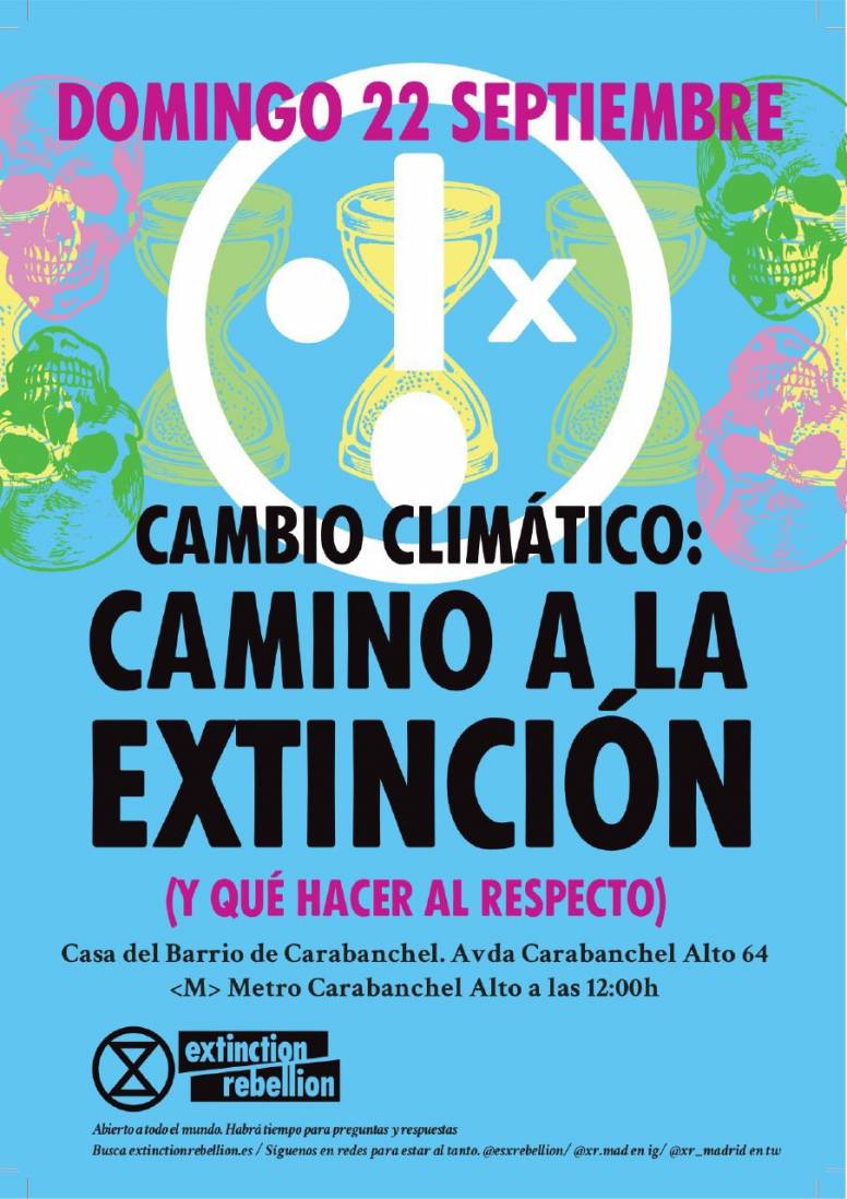 La charla "Camino a la extinción y qué hacer al respecto" está compuesta por dos bloques, siendo el primero un compendio de datos científicos sobre la crisis climática que nos alertan de su gravedad y dependencia directa de los ecosistemas, biodiversidad y estabilidad social. El segundo bloque estudia la desobediencia civil como método de cambio social y su aplicación directa en Extinction Rebellion a través de sus demandas y principios, introduciendo el origen del movimiento, sus éxitos y método organizativo.