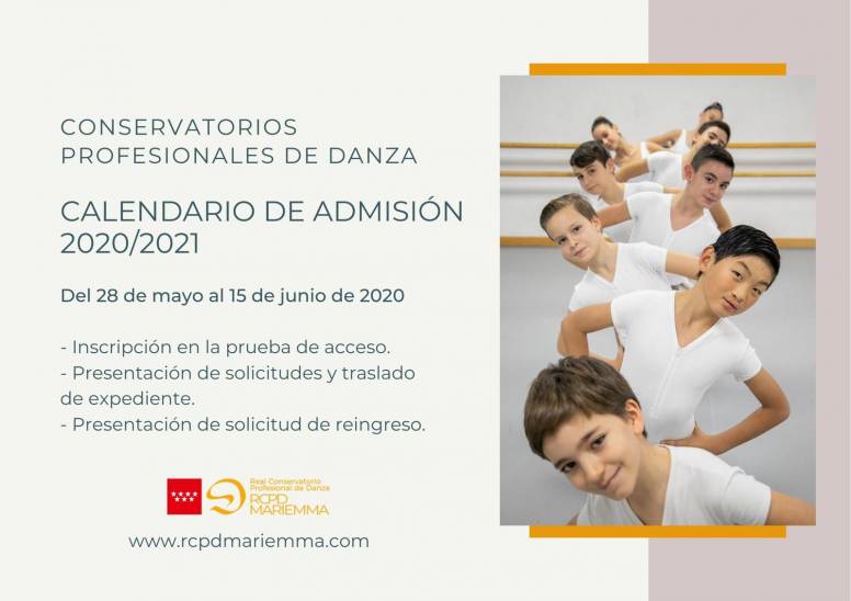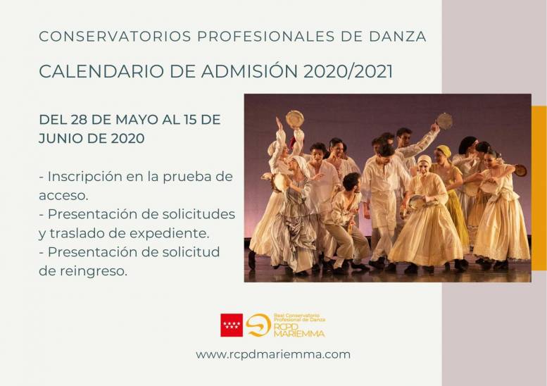 Comienzan los plazos de enseñanza de danza profesional para el curso 2020 2021. Inscripciones telemática en la web: rcpdmarimma.com o de forma presencial en el centro. Las solicitudes de acceso son del 28 de mayo al 15 de junio. Con cita previa: Tel 91468 0651. El próximo curso será especial lleno de danza alegría y amor