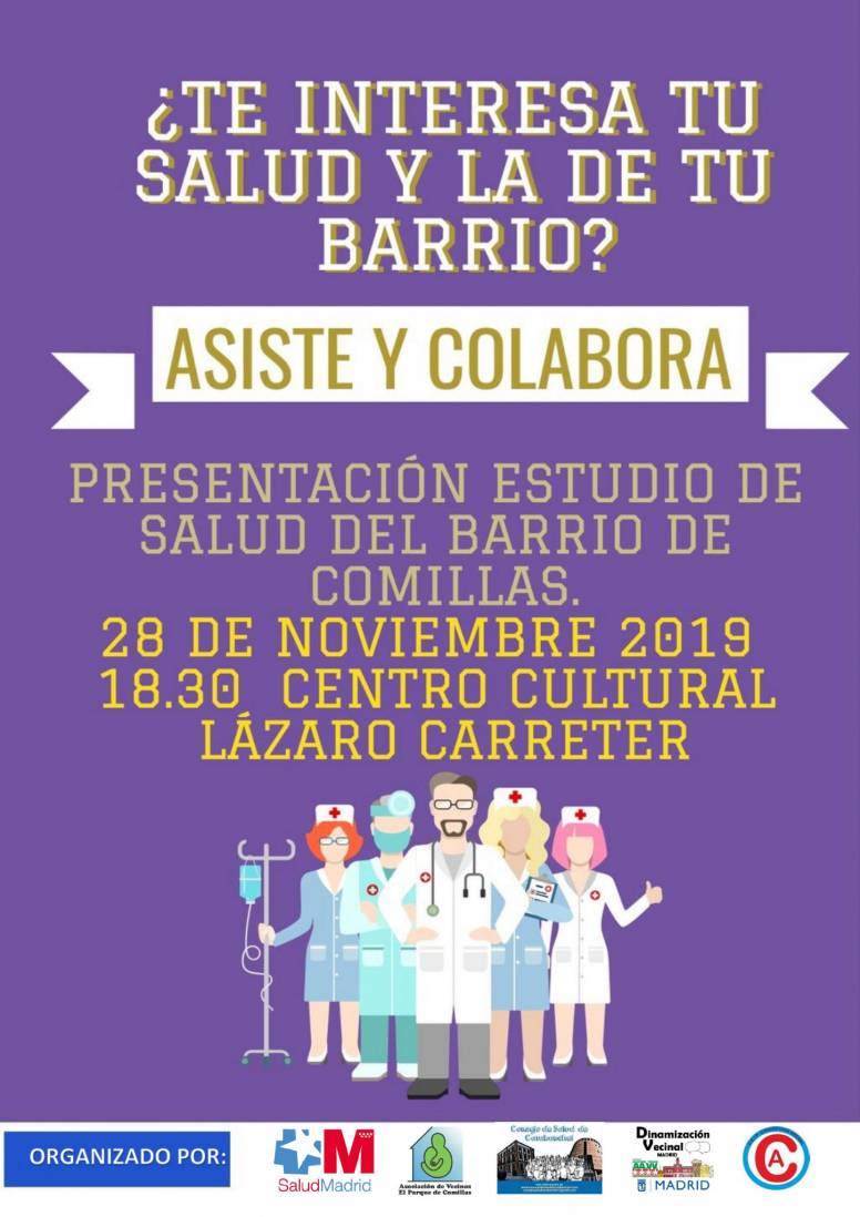 Acude a la📊 PRESENTACIÓN del ESTUDIO de SALUD 📊 elaborado por distintas entidades del barrio de Comillas🏡 el 📍 JUEVES 28 de Noviembre a las 18,30 ⏰ en el Centro Cultural Lázaro Carreter.