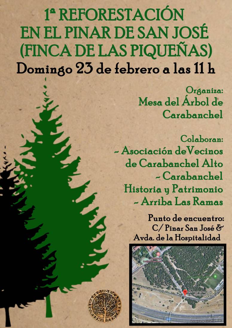 El domingo 23 de febrero, a las 11:00, tendrá lugar la primera reforestación del Pinar de San José en “Las Piqueñas”. La acción está organizada por la Mesa del Árbol de Carabanchel, y colaboran, entre otros, la A.V. de Carabanchel Alto, Carabanchel Historia y Patrimonio, Arriba las Ramas y la Asociación Trasluz. Anímate y pásate por allí a reforestar con tus vecinos, te esperan.