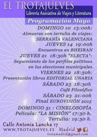 La librería El Trotajueves nos hace llegar su programación de mayo, bien variada e interesante. El jueves 14, a las 19:00, tendremos una nueva cita de sus Encuentros en Bheiran, un viaje apasionante con el que soñar. El jueves 21, a las 18:30, será el turno de Electa, seguimiento de los perfiles políticos en las elecciones municipales. El viernes 22, también a las 18:30, presentación de obras de la Editorial Unaria. Al día siguiente, sábado 23, a las 18:30, Café filosófico; y por la tarde, a las 21:00, para desengrasar, retransmisión en directo de la final de Eurovisión 2015. Para terminar el mes, el domingo 31 habrá Cinelosofía, con la película La misión a las 17:30, y tertulia filosófica a las 19:30. Como puedes ver, en esta librería hay de todo: pásate por allí y descúbrelo tú mismo. Dónde: C/ Antonia Lancha, 17. Cuándo: varias fechas. Más información: www.trotajueves.es.Pachangajazz, en la Sala Tarambana