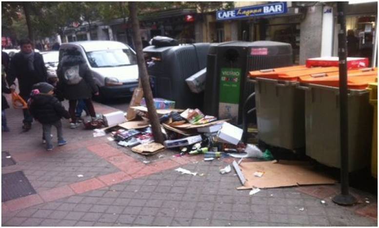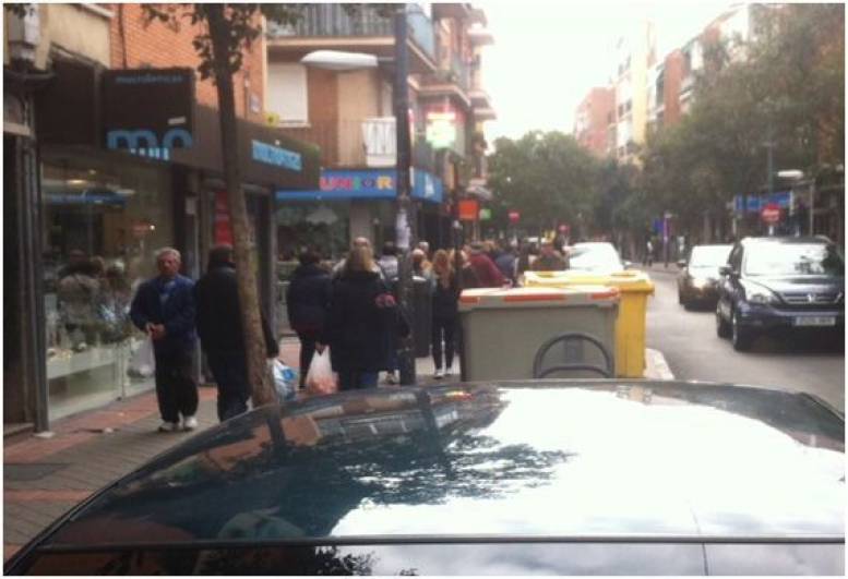 La actividad comercial continúa siendo notable, a pesar de las dificultades de los pequeños negocios de la zona (foto 2), de la inacción por parte del grupo popular que dirige la ciudad a lo que se suma la tremenda suciedad que se ha podido llegar a ver en algunas ocasiones, tal y como se puede apreciar en la foto número 3, tomada el día 4 de Enero de 2015, denunciada in situ por un vocal vecino de UPyD en Carabanchel.