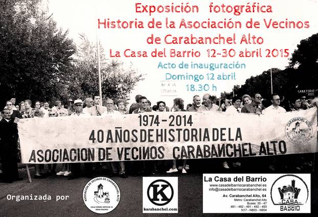 Es seguro que sin la asociación de vecinos, muchas de estas cosas no se habrían logrado, y otras habrían tardado más tiempo. Por ello, para conmemorar estos cuarenta años y recordar las cosas que se han hecho y cómo ha ido cambiando el barrio, con sus vecinos como personaje principal, la asociación ha organizado una exposición fotográfica. La muestra, titulada Historia de la Asociación de Vecinos de Carabanchel Alto, se inaugurará el domingo 12 de abril a las 18:30, y podrá visitarse durante todo el mes en La Casa del Barrio (Avda. Carabanchel Alto, 64). Organizan la A.V. Carabanchel Alto, Karabanchel.com y La Casa del Barrio.