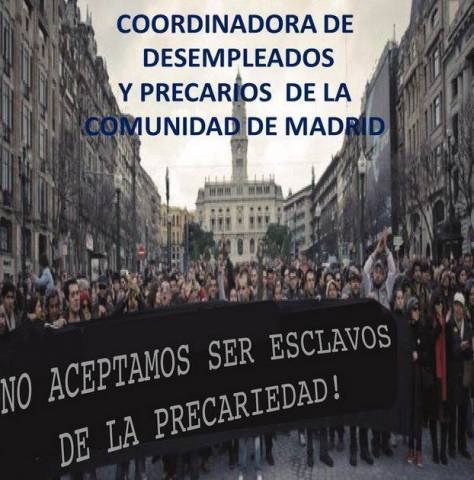 La Coordinadora de Desempleados y Precarios de la Comunidad de Madrid, nacida el 17 de abril de 2015, decide presentarse oficialmente por medio de este comunicado, para hacerse escuchar y exponer las necesidades y condiciones de vida de los desempleados (aproximadamente el 60% de los mismos no recibe ayuda de ningún tipo).Las diferentes plataformas, asociaciones, asambleas y personas a título individual que la forman, nacen como apoyo a los desempleados y precarios de los barrios y municipios a los que pertenecen, y gracias a estos colectivos muchos de ellos han encontrado trabajo. Los miembros que las integran son personas desempleadas y precarias, sobre todo de larga duración, que están interesadas en conseguir un empleo digno y unos ingresos mínimos para ellos.