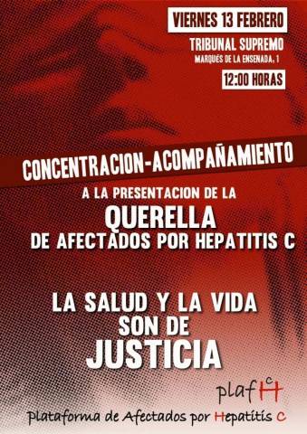 4.- Como consecuencia de todo ello la Plataforma de Afectados por Hepatitis C reclamamos unos PARTIDA PRESUPUESTARIA EXTRAORDINARIA QUE GARANTICE LA MEDICACION NECESARIA PARA LOS ENFERMOS DE HEPATITIS C, sin recortes políticos que nos conducen a la enfermedad y la muerte en medio del silencio y/o complicidad de todos los organismos e instituciones obligados a velar por los derechos de la población. Exigencia que hacemos extensible a todos los demás enfermos sin la atención médica, hospitalaria, o farmacéutica que se requiere para su curación.