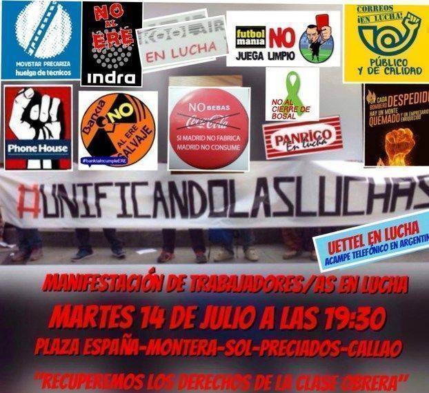 La plataforma Unificando las luchas que agrupa diversos conflictos y luchas laborales volvemos a salir a la calle para, en primer lugar, demostrar que la concentración de Sol no fue un acto aislado sino el comienzo de una firme lucha basada en la unidad de acción contra distintos patrones pero un mismo enemigo, el capital y su sistema injusto de explotación y segundo para lograr que el conjunto de la clase obrera, tanto en activo como a parados, se unan a nosotros a exigir que nos devuelvan todos los derechos robados durante décadas a base de reformas laborales, pactos, estatutos y convenios.