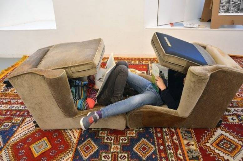 espacio propone a niños y niñas buscar su postura ideal en una butaca para leer un libro. Un