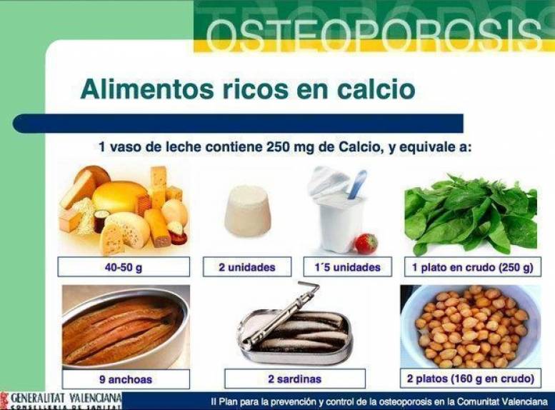 — Alimentos ricos en calcio: leche y derivados, verduras de hoja verde (acelga, espinaca, brócoli), lubina, sardinas en aceite, cereales de arroz y maíz, fabada...