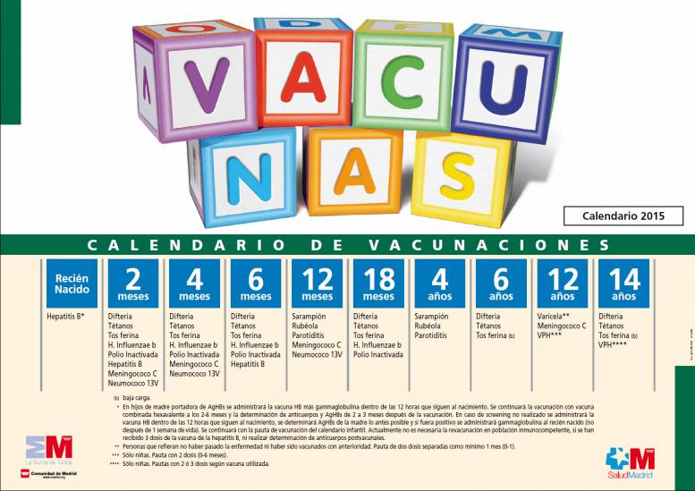 La Consejería de Sanidad de la Comunidad de Madrid ha puesto en marcha un nuevo calendario de vacunación infantil a partir del 1 de enero de 2015, con las siguientes modificaciones:
