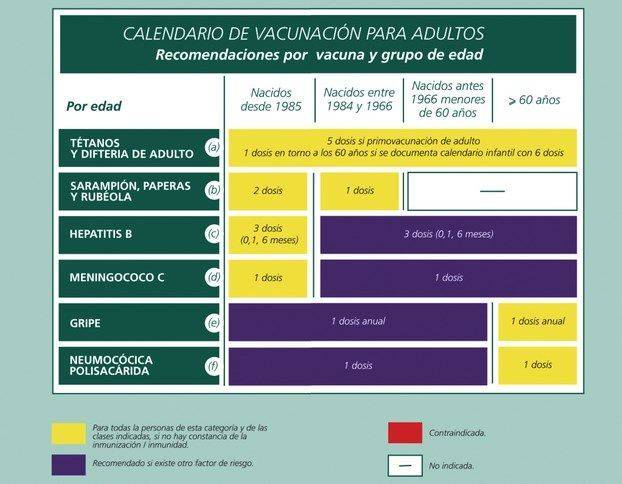 estrategias más efectivas de la prevención. Es uno de los mecanismos que más ha contribuido en la lucha contra las enfermedades infecciosas.El calendario vacunal en la infancia se completa, por la mayoría de las familias, en las revisiones periódicas de los centros de salud, enfocadas al seguimiento del crecimiento de los niños. El calendario de vacunas de los adultos se va actualizando gracias a las campañas de difusión destinadas para ello. Sin embargo, la edad adulta es un periodo en el que el seguimiento y la actualización de las vacunas disminuye, y es importante mantenerlas actualizadas, ya que, aunque hayamos sido vacunados en la infancia, la protección frente a algunas enfermedades disminuye con la edad.