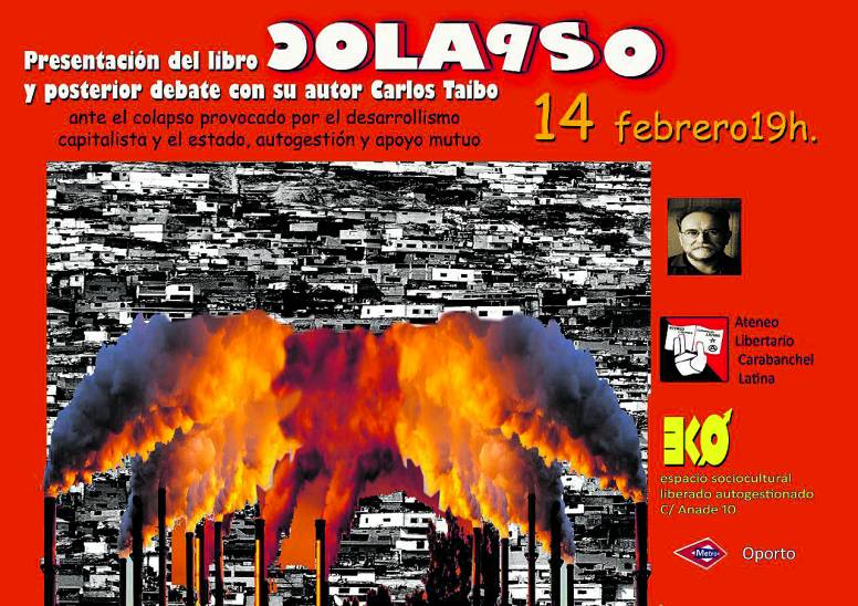El Ateneo Libertario de Carabanchel Latina ha organizado la presentación del libro Colapso, a cargo de su autor Carlos Taibo, profesor de Ciencia Política y de la Administración en la Universidad Autónoma de Madrid, activista y autor de una extensa bibliografía sobre temas políticos, económicos y sociales. En Colapso repasa, entre otros temas, “las insuficiencias de cierto activismo ecologista que no realiza la necesaria crítica al desarrollismo capitalista y el Estado, junto con sus propuestas por el apoyo mutuo y la autogestión en comunidades desmercantilizadas, despatriarcalizadas, descomplejizadas, etc., después del colapso civilizatorio que se avecina”.
