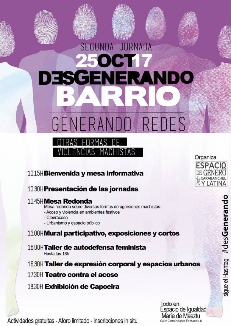2º Jornada del espacio de género Carabanchel y Latina De- generando Barrio (Generando redes). Otras formas de violencias machista, dirigidas a población general con el objetivo de dar a conocer el trabajo realizado por el Espacio de Género, así como reflexionar y sensibilizar sobre la realidad de las mujeres en diferentes aspectos.