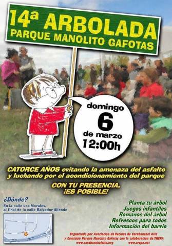 Con todo esto, un año más, la A.V. de Carabanchel Alto celebrará la XIV Arbolada por el Parque Manolito Gafotas el domingo 6 de marzo, a las 12:00, en la confluencia de C/ Salvador Allende con C/ Los Morales. Plantaremos árboles, escucharemos el célebre Romance del árbol y nos calentaremos con un caldito. En esta ocasión, esperamos que nos acompañe la concejala de Carabanchel, Esther Gómez, y por qué no, la concejala de Medio Ambiente y Movilidad, Inés Sabanés, quien fue asidua a las primeras arboladas reivindicativas.