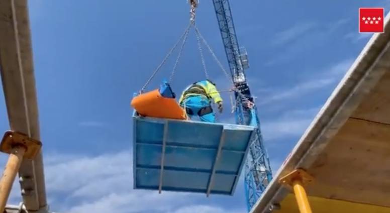 Un trabajador cae desde 3 metros sufriendo traumatismos graves en abdomen y espalda. #SUMMA112 utiliza una de las grúas de la obra para evacuarlo.
