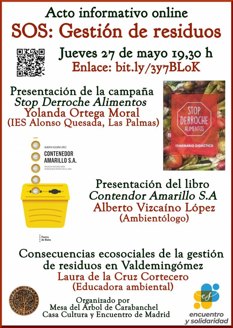 El jueves 27 de mayo a las 19:30 h. la Mesa del Árbol de Carabanchel y la Casa de Cultura y Encuentro de Madrid organizamos un acto informativo online denominado “S.O.S. : Gestión de Residuos”.