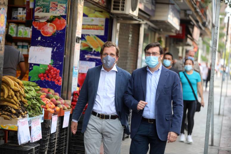 El alcalde de Madrid, José Luis Martínez-Almeida, junto al concejal de Carabanchel, Álvaro González, ha visitado hoy el eje comercial del Camino Viejo de Leganés para impulsar la campaña organizada por el distrito ‘Compra seguro, compra en tu barrio’ que pretende animar a los vecinos a consumir en las tiendas de proximidad, ayudando así al mantenimiento y sostenibilidad del comercio de siempre ante la crisis provocada por la pandemia de la COVID-19.