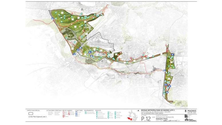 Este plan, de iniciativa pública, persigue desarrollar el Bosque Metropolitano en el suroeste, para conectar los parques regionales del Manzanares y del Guadarrama, interviniendo en suelos de borde con los municipios de Pozuelo, Alcorcón y Leganés para lograr una conectividad verde. La superficie del ámbito del lote 5 asciende a 1.393 hectáreas.