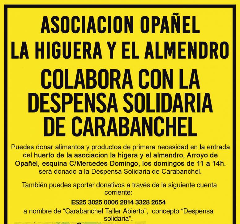 Por otro lado, la asociación ha anunciado que a partir del domingo 5 de julio han comenzado a recogerse semanalmente alimentos y productos de higiene entre las 11:00 y las 14:00. Todo ello se destinará a la Despensa Solidaria de Carabanchel, una iniciativa que ya nutre de necesidades básicas a cientos de familias y se ha convertido en uno de los focos de solidaridad imprescindibles del barrio.