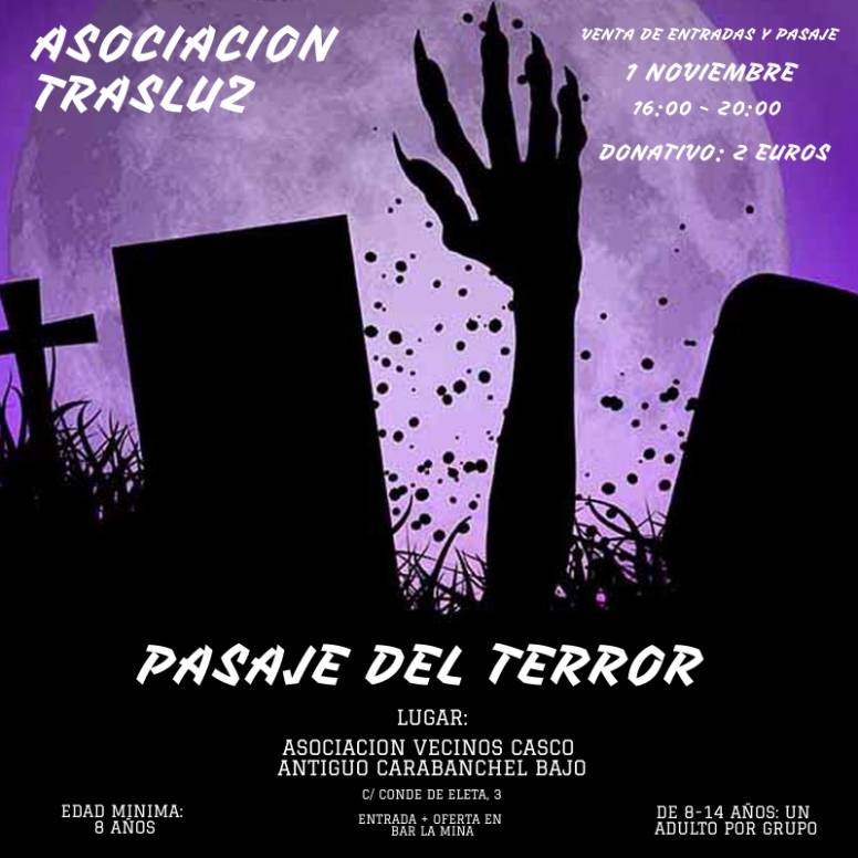Trasluz que centra sus esfuerzos en actividades para los más pequeños, en forma de excursiones, convivencias, talleres y campamentos veranos, sus “Colonias”, ha decidido dar un paso más y abrirse al barrio. La idea lleva rondando años en las cabezas de la asociación, ya que cada verano dedican en su campamento de 14 días, una noche a trabajar el miedo con los más pequeños a través de un pasaje. El terror se apodera de todo y el campamento se transforma en un par de horas en un lugar totalmente distinto. Preparado y montado en tiempo record los más pequeños agradecen su esfuerzo y cada verano piden más.