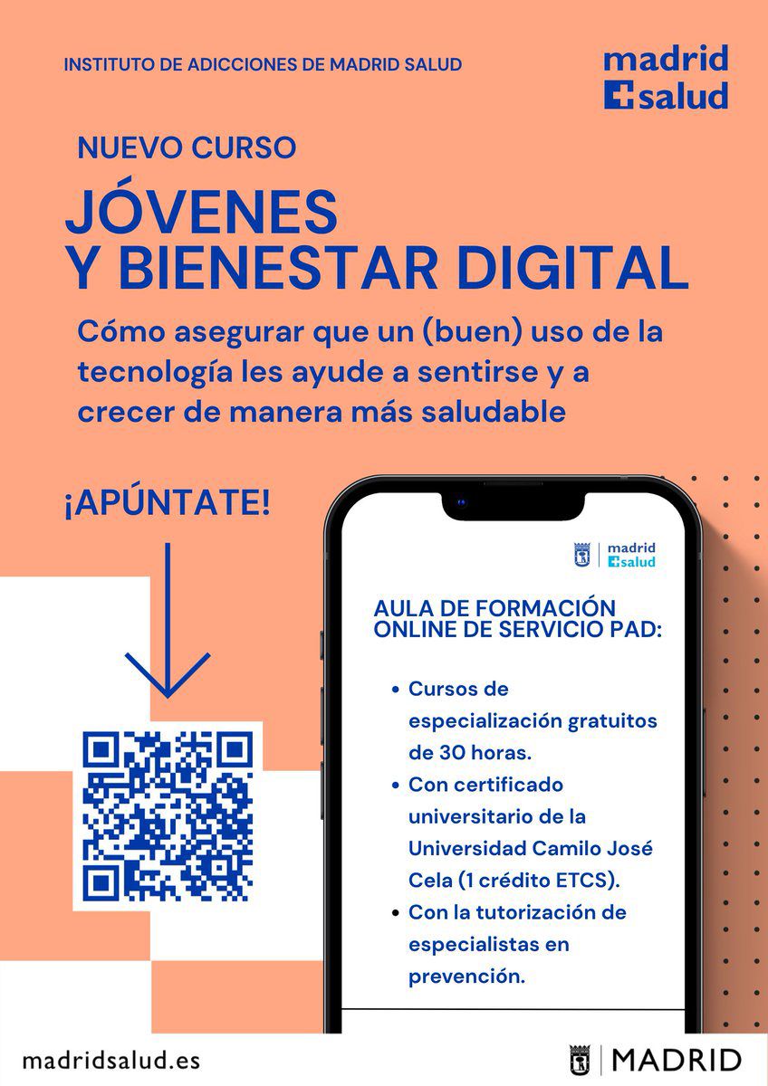 Conscientes de esta necesidad, desde el Instituto de Adicciones de Madrid Salud se ha puesto en marcha el Programa Bienestar Digital, una iniciativa dirigida principalmente a adolescentes y jóvenes, pero que también implica a su entorno: familias, profesorado, mediadores comunitarios, personal de recursos juveniles, deportivos, culturales y de tiempo libre, así como a los equipos técnicos de las juntas municipales de distrito. Porque el bienestar digital es una tarea compartida.