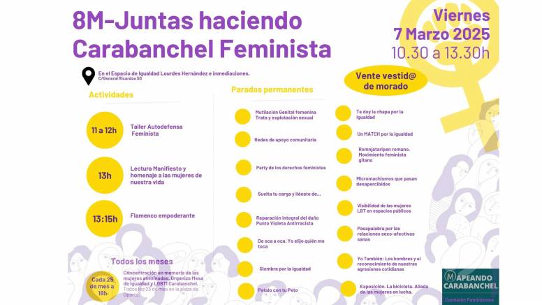 “8M - Juntas haciendo Carabanchel Feminista” es una iniciativa impulsada por la Comisión de Feminismos de Mapeando Carabanchel, con el propósito de fomentar la sororidad, la concienciación y la acción colectiva en favor de los derechos de las mujeres.