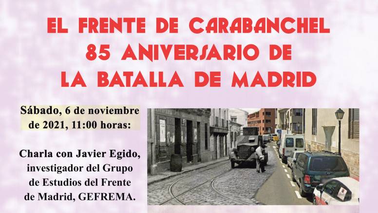 La charla, que tendrá lugar el sábado 6 de noviembre a las 11:00 en la Casa del Barrio (Avda. Carabanchel Alto, 64) versará sobre el frente de Carabanchel en la batalla de Madrid, y correrá a cargo de Javier Egido (GEFREMA). Y para mostrar en el terreno lo explicado en la charla, el propio Egido guiará una ruta por el Distrito al día siguiente, a las 10:00.