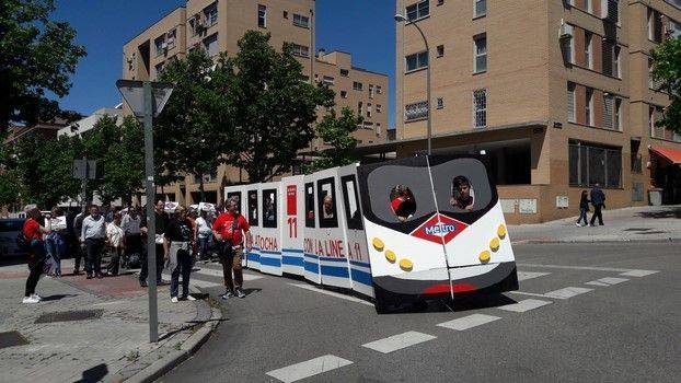 En la manifestación, que ha recorrido las calles del barrio desde la estación de Carabanchel Alto hasta La Peseta, ha circulado un metro construido por los vecinos y transportado por ellos mismos.