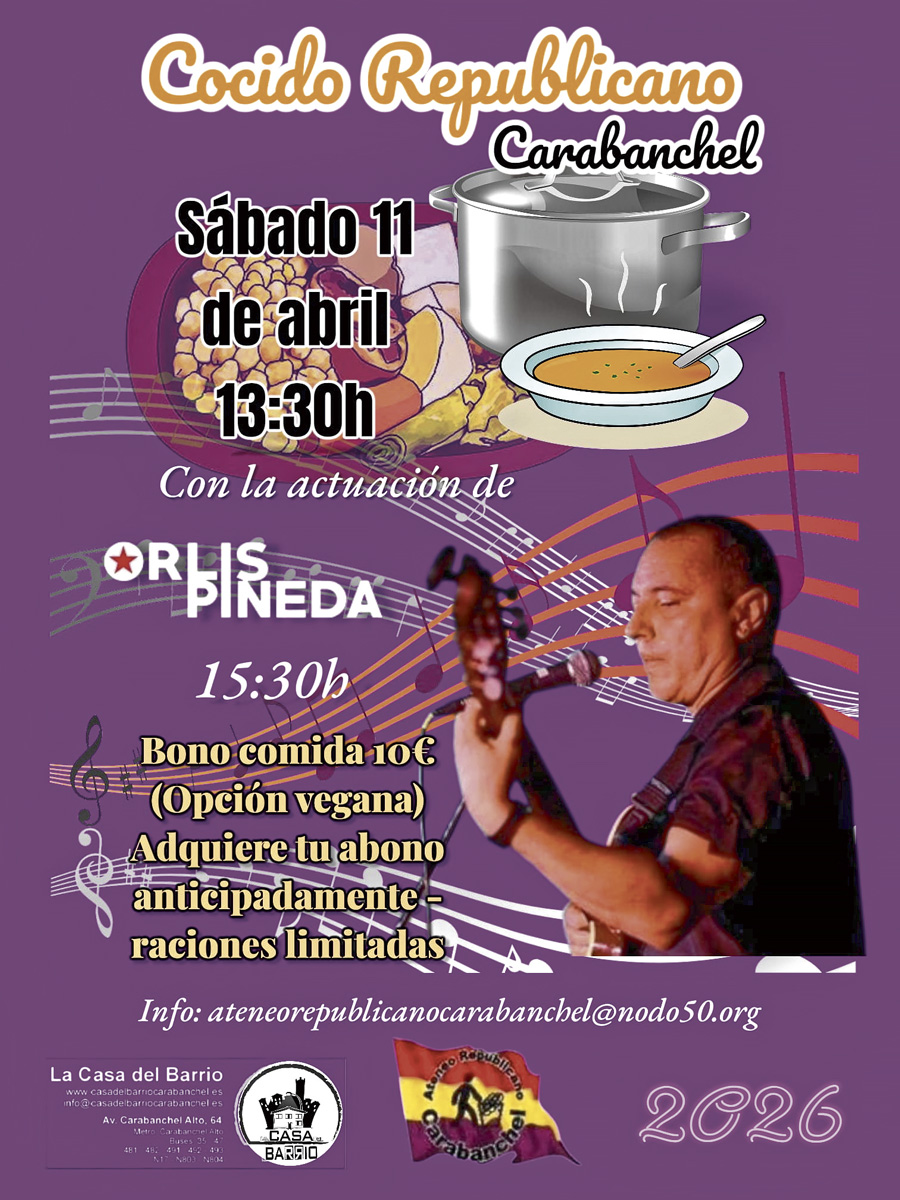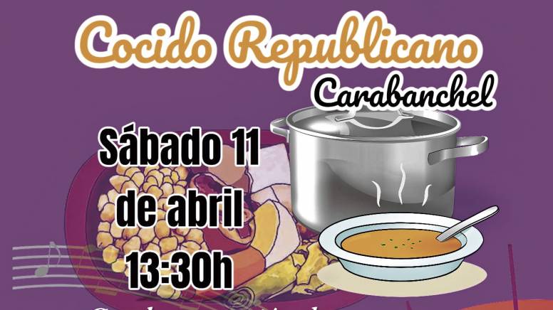 Un año más, queremos celebrar la República en Carabanchel. Para ello te animamos a participar en el tradicional Cocido Republicano de Carabanchel el sábado 11 de abril a partir de las 13:30, para lo cual tienes que adquirir previamente el bono de 10 euros contactando con el Ateneo Republicano a través del correo electrónico ateneorepublicanocarabanchel@nodo50.org