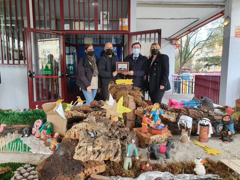 El concejal del distrito de Carabanchel, Álvaro González, ha entregado el pasado lunes al CEIP Miguel Servet la placa conmemorativa del primer premio del segundo Certamen de Belenes organizado por la junta municipal. El jurado ha valorado que en la elaboración del belén han participado todas las clases del colegio, el material utilizado ha sido natural y reciclable, las figuras tienen un tamaño parecido; en la composición, han logrado una armonía en la que el belén tiene apariencia de ciudad y cumple el requisito de ser transportable, lo que va a permitir trasladarlo a la junta municipal, donde se expondrá.