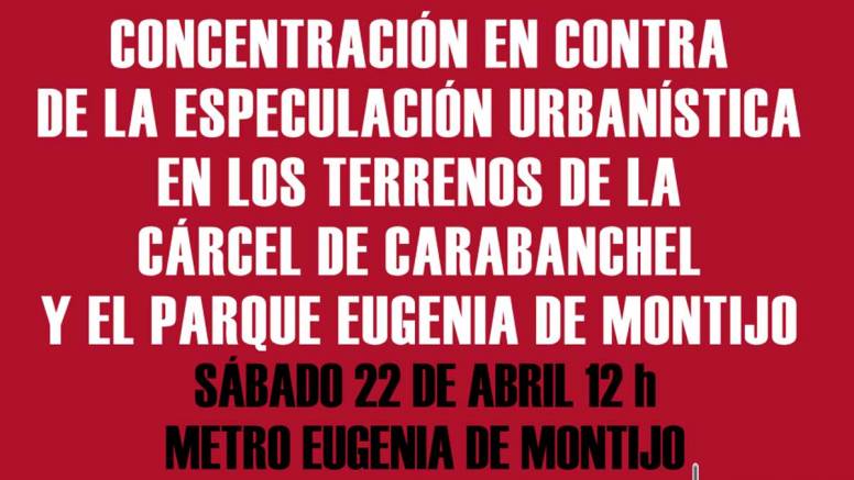 El próximo sábado 22 de abril a las 12 h se celebrará una concentración en contra de la especulación inmobiliaria en los terrenos de la Cárcel de Carabanchel y el Parque de Eugenia de Montijo organizada por varios colectivos vecinales de los distritos de Carabanchel y Latina. Comenzará en la estación de Metro de Eugenia de Montijo.