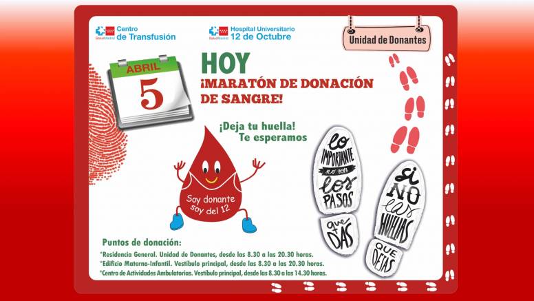 El Hospital 12 de Octubre celebra hoy martes 5 de abril un nuevo Maratón de Donación de Sangre bajo el lema No importa los pasos que das, si no las huellas que dejas. Y esta huella puede salvar hasta tres vidas.