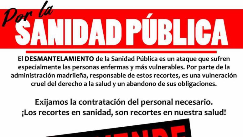 Miércoles 13 de marzo, a las 18:30, concentraciones simultáneas ante cinco hospitales madrileños; jueves 14 de marzo, a las 18:30, manifestación desde el Centro de Salud Abrantes hasta la plaza de Oporto