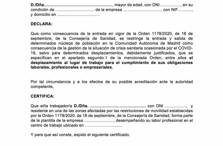 Que el/la trabajador/a D./Dña. …………………………………, con DNI ……………, y residente en una de las zonas afectadas por las restricciones de movilidad establecidas por la Orden 1178/2020, de 18 de septiembre, de la Consejería de Sanidad, forma parte de la plantilla de la empresa …………………, desempeñando su labor profesional en el centro de trabajo ubicado en ……………………...