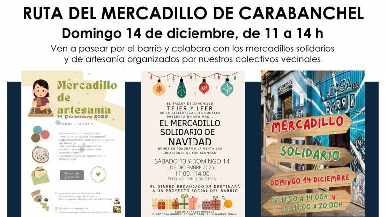 Estos sábado 13 y domingo 14 de diciembre, de 11:00 a 14:00 y de 17:00 a 20:00 el barrio se llena de vida, creatividad y solidaridad. Tres mercadillos, tres paradas mágicas, un mismo espíritu vecinal: crear, apoyar y disfrutar. ¡Prepárate para un paseo que te hará sentir el orgullo de pertenecer a Carabanchel!