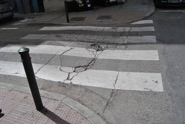 Y es que el deterioro es general… Por ejemplo, en lo relativo al viario, llama la atención la cantidad de socavones que encontramos, un peligro tanto para los coches como para los peatones, por estar no pocos de ellos en pasos de cebra. “Cualquier persona se puede romper una pierna ahí, sobre todo por la noche, porque también hay que decir que la iluminación del barrio es muy escasa”, razona Victoria.
