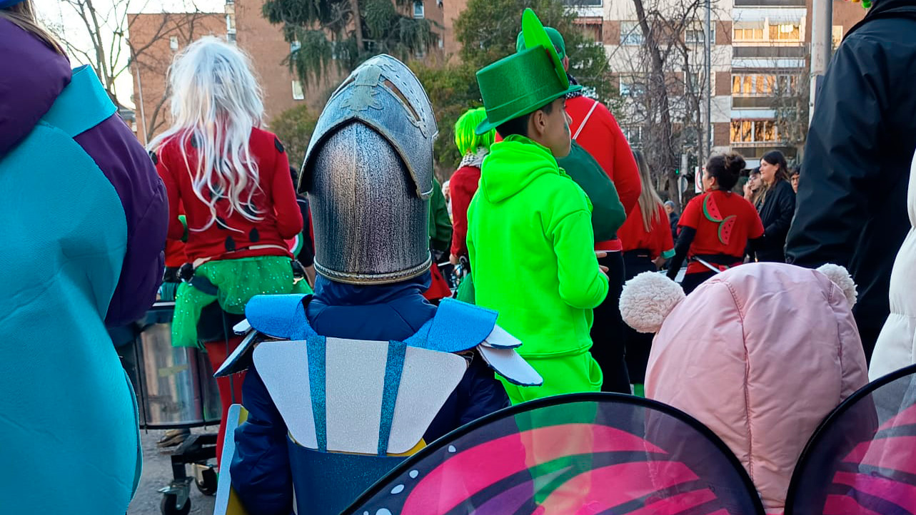 Se fueron uniendo al mismo más personas que aguardaban disfrazadas y con ganas de pasarlo bien en las aceras. Vecinos y vecinas que, al escuchar los ritmos de las batucadas y la fanfarria, se asomaron con curiosidad a los balcones, les saludamos y les animamos para que el año que viene bajen a vivirlo en plena calle. Muchas personas preguntaban: “¿Es gratis? ¿Hay que ir con el cole?”. Para aquellas personas que aún les surjan las dudas: Carnabanchel es el carnaval popular que prepara durante meses un grupito de vecinas de Carabanchel (Peña Chelere, vamos con el peto rojo) y que, con la ayuda de asociaciones y proyectos colaboradores del barrio, sale año tras año adelante. Todo lo que se sueña, se piensa y se materializa en Carnabanchel nace de la ilusión, el esfuerzo colectivo y las ganas de hacer barrio. Juntas ocupamos las calles y avenidas, las llenamos de risas, colores, disfraces ingeniosos, reivindicativos, divertidos… Porque Carabanchel se merece tener su carnaval, y cada vez sois más las que os sumáis a participar. Grandes y mayores, sobre ruedas, en gran grupo o en familia. Carnabanchel volvió a ser un carnaval diverso donde nadie se queda fuera.