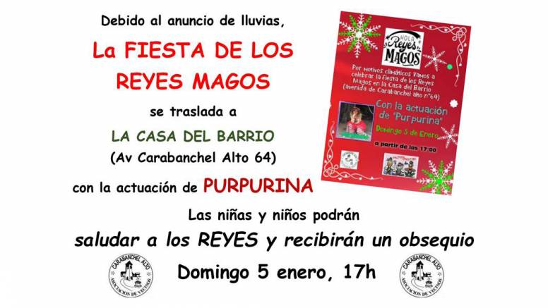 Como cada año, los más peques de Carabanchel Alto invitan a sus amigos los Reyes Magos a que recojan sus cartas con sus deseos en una fiesta a la que todo el Distrito está invitado. En un principio estaba prevista en la plaza del Parterre, pero por motivos climáticos la celebración se ha trasladado a La Casa del Barrio (Avda. de Carabanchel Alto, 64), donde el domingo 5 de enero, a partir de las 17:00, las niñas y niños podrán saludar a los Reyes y recibirán un obsequio. Además, disfrutarán de la fabulosa actuación de “Purpurina”.