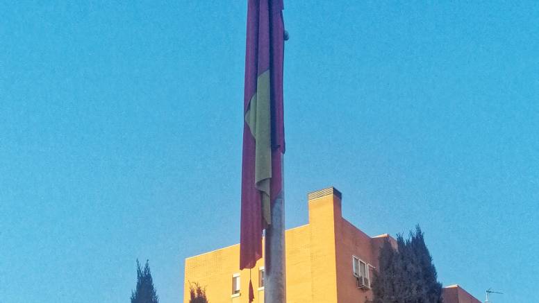 Sin llegar al año de ondeo, la bandera en cuestión fue sustituida, antes de que se la llevara el viento de envejecimiento prematuro. Y en menos de un año después del primer cambio, la nueva enseña se pliega intentando evitar mostrar sus vergüenzas: los colores rojo y gualda ya grisáceos de la polución y el lienzo con las esquinas rotas y desgarradas por el viento.