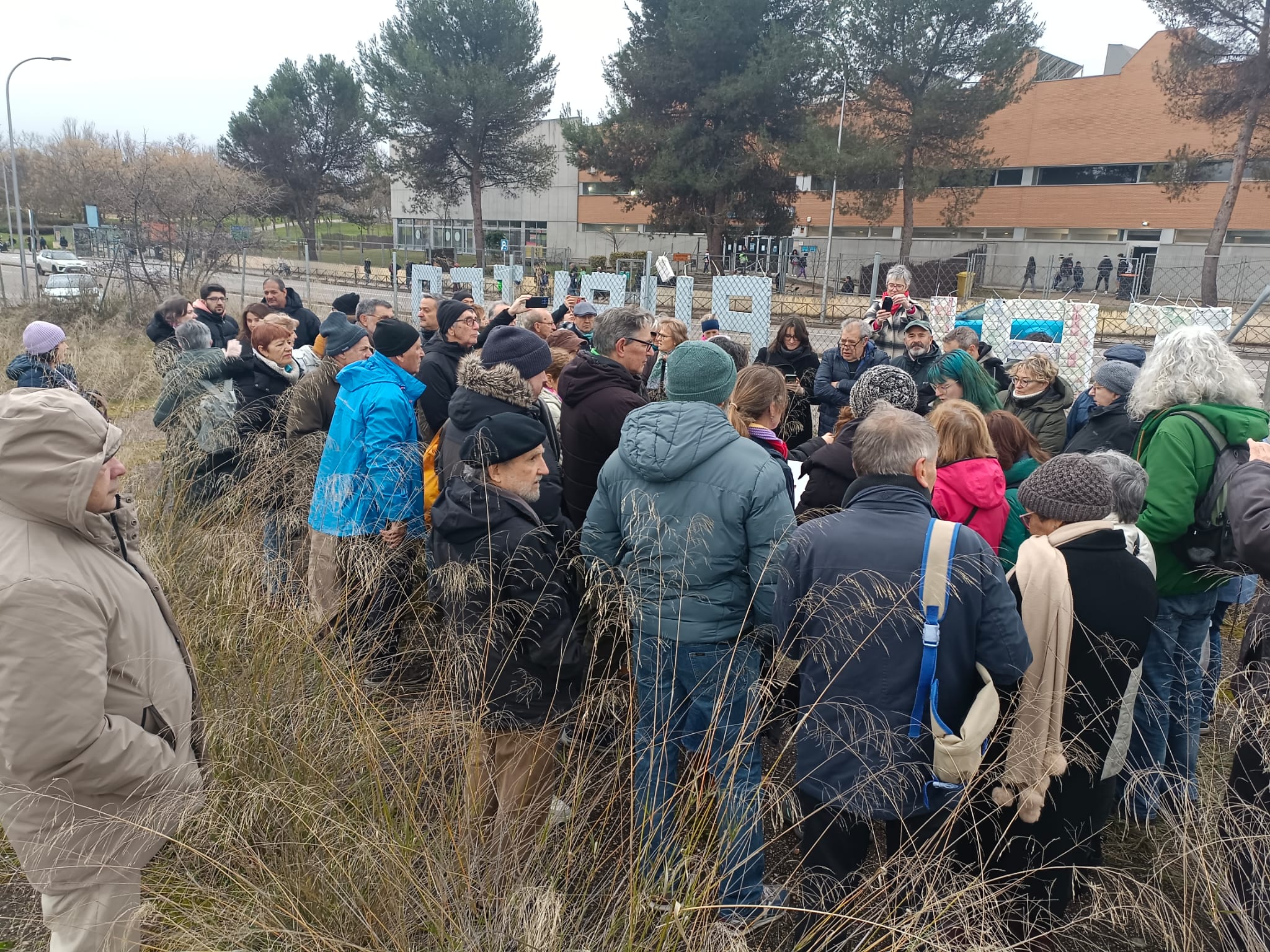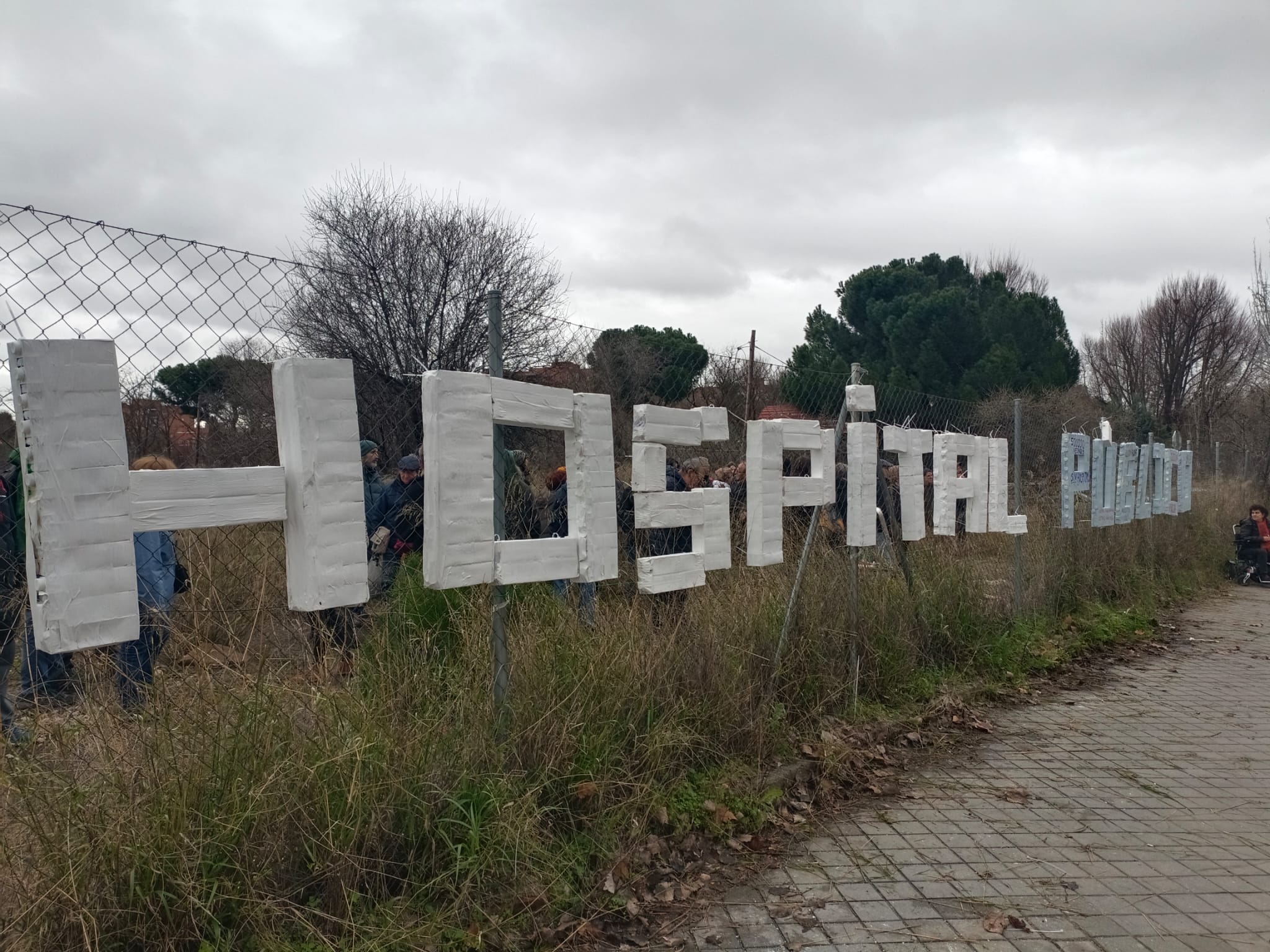 Pese al mal tiempo que padece Madrid en las últimas semanas, el rótulo ha quedado colocado en la valla del solar para llamar la atención de vecinos y transeúntes y sobre todo a las autoridades responsables de que la construcción del centro sea una realidad en un plazo breve de tiempo.