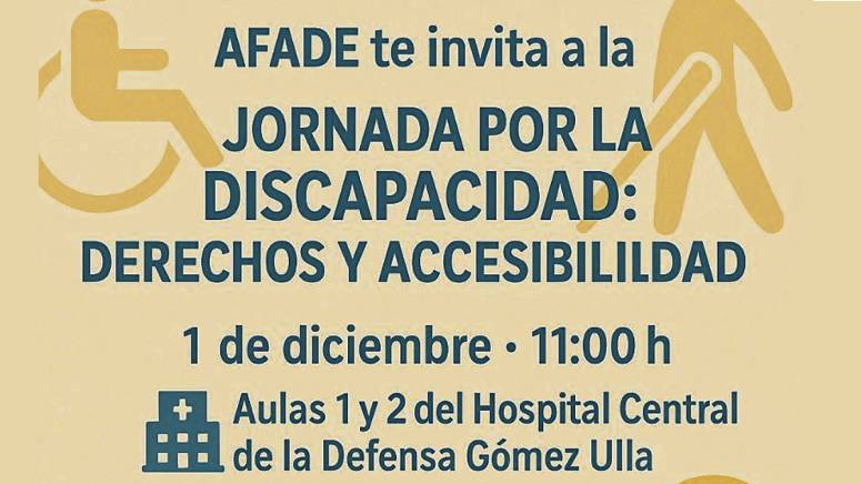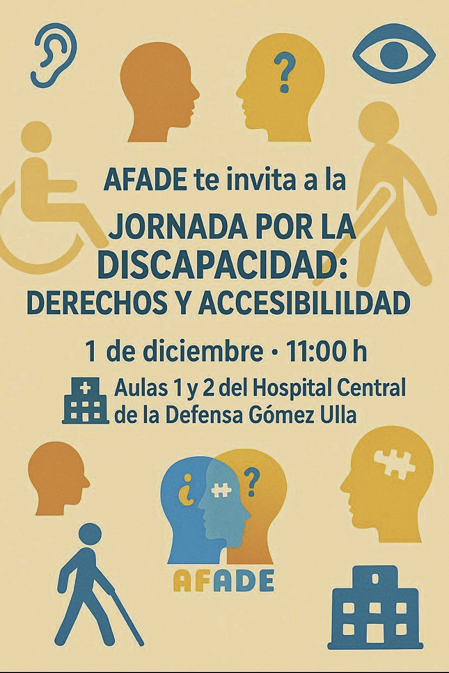 El 1 de diciembre, a partir de las 11:00 en las aulas 1 y 2 del Hospital Central de la Defensa Gómez Ulla, tendrá lugar la Jornada por la Discapacidad: Derechos y Accesibilidad. El evento está organizado por AFADE, Asociación de Familiares de Enfermos de Alzheimer, que brinda información y apoyo integral a enfermos y cuidadores y promueve acciones de voluntariado para ayuda de las familias.